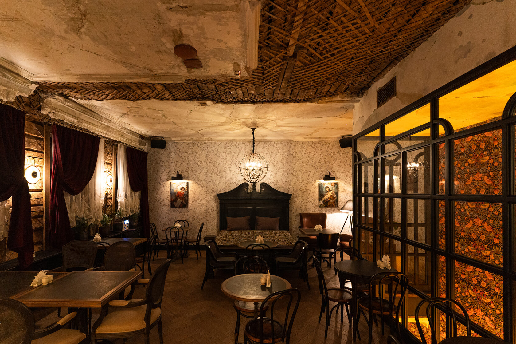 Спальня - тихий и уютный зал, больше ресторанного формата, где можно спокойно провести свой вечер, покушать и выпить коктейли, которые посвящены творчеству русских поэтов.